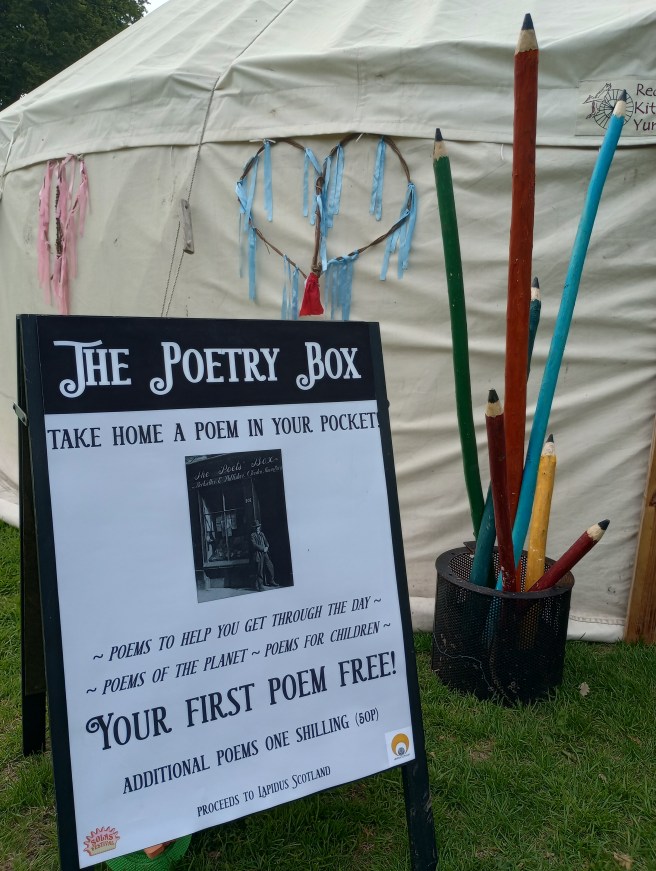 I spent Saturday in a yurt at the Solas Festival, dispensing poems and blether on behalf of Lapidus Scotland. I loved it when people arrived saying that poetry wasn’t really their thing then spent ten minutes browsing the poems (on postcards, all donated by Lapidus members) before going away clutching one like it was an unexpected treat.